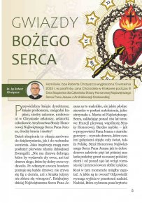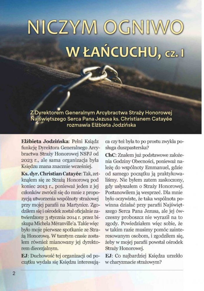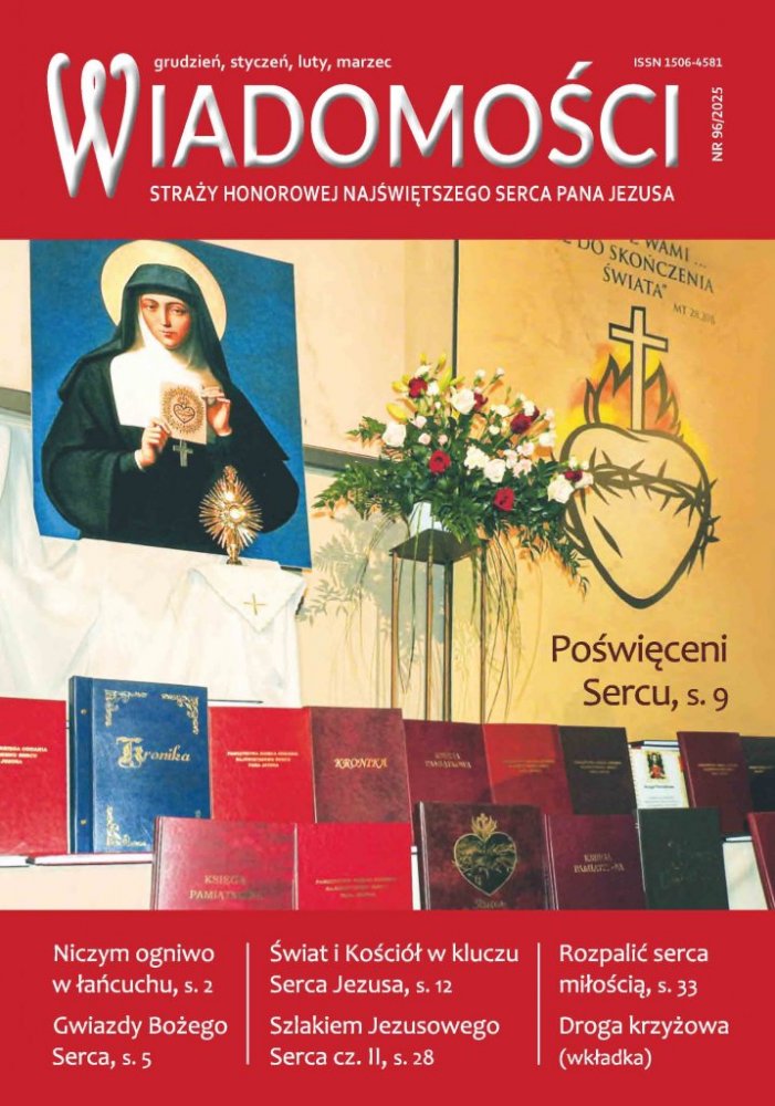 Najnowsze wydanie czasopisma strażowego rozpoczyna się wywiadem przeprowadzonym przez Elżbietę Jodzińską z ks. Christianem Catayée, Dyrektorem Generalnym Arcybractwa Straży Honorowej Najświętszego Serca Pana Jezusa (art. Niczym ogniwo w łańcuchu, cz. I). W kolejnych tekstach powracamy do wydarzeń z ostatnich miesięcy, takich jak: poświęcenie diecezji bielsko-żywieckiej Najświętszemu Sercu Pana Jezusa (art. Poświęceni Sercu), V konferencja pastoralna Sercańskiego Centrum Duchowości (art. Świat i Kościół w kluczu Serca Jezusa), pielgrzymka jubileuszowa do Francji i Włoch (art. Szlakiem Jezusowego Serca, cz. II) oraz III Dzień Skupienia dla Członków Straży Honorowej z Archidiecezji Krakowskiej (homilia ks. bpa Roberta Chrząszcza Gwiazdy Bożego Serca). Relacje z życia strażowego w ośrodkach i diecezjach można znaleźć w dziale W naszym życiu strażowym, rubryka Strażowe ABC poświęcona została zagadnieniu odznaki Serca Jezusowego, natomiast w Skarbczyku Małego Rycerza proponujemy konkurs dla dzieci na napisanie świadectwa z przeżywania Godziny Obecności. W nadchodzących miesiącach warto sięgać również po nauczanie św. Franciszka Salezego (art. Rozpalić serca miłością, wkładka Zanurzeni w miłości) i wracać do rad założycielki Straży Honorowej Najświętszego Serca Pana Jezusa (art. Rady i myśli, wkładka O dobry krzyżu!).