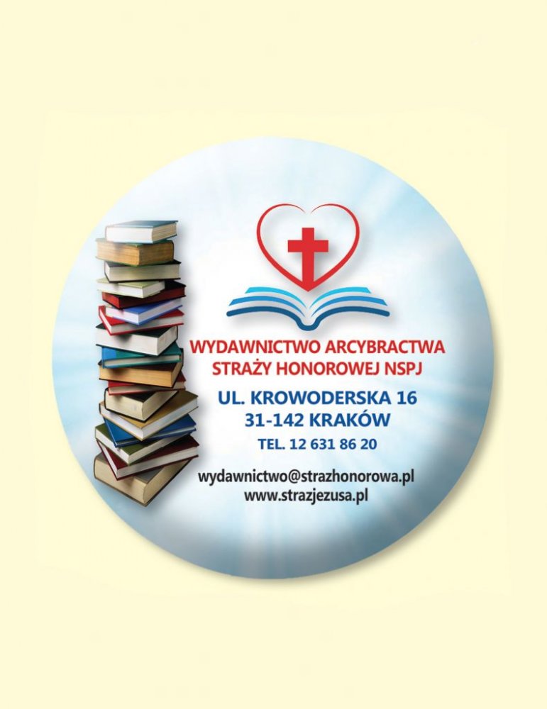 Niewielki, okrągły magnes, na którym umieszczono logo Wydawnictwa Arcybractwa Straży Honorowej Najświętszego Serca Pana Jezusa oraz adres korespondencyjny, numer telefonu, e-mail i adres strony internetowej naszego sklepu. Gadżet można przyczepić do lodówki, by mieć zawsze pod ręką dane kontaktowe do wydawnictwa.