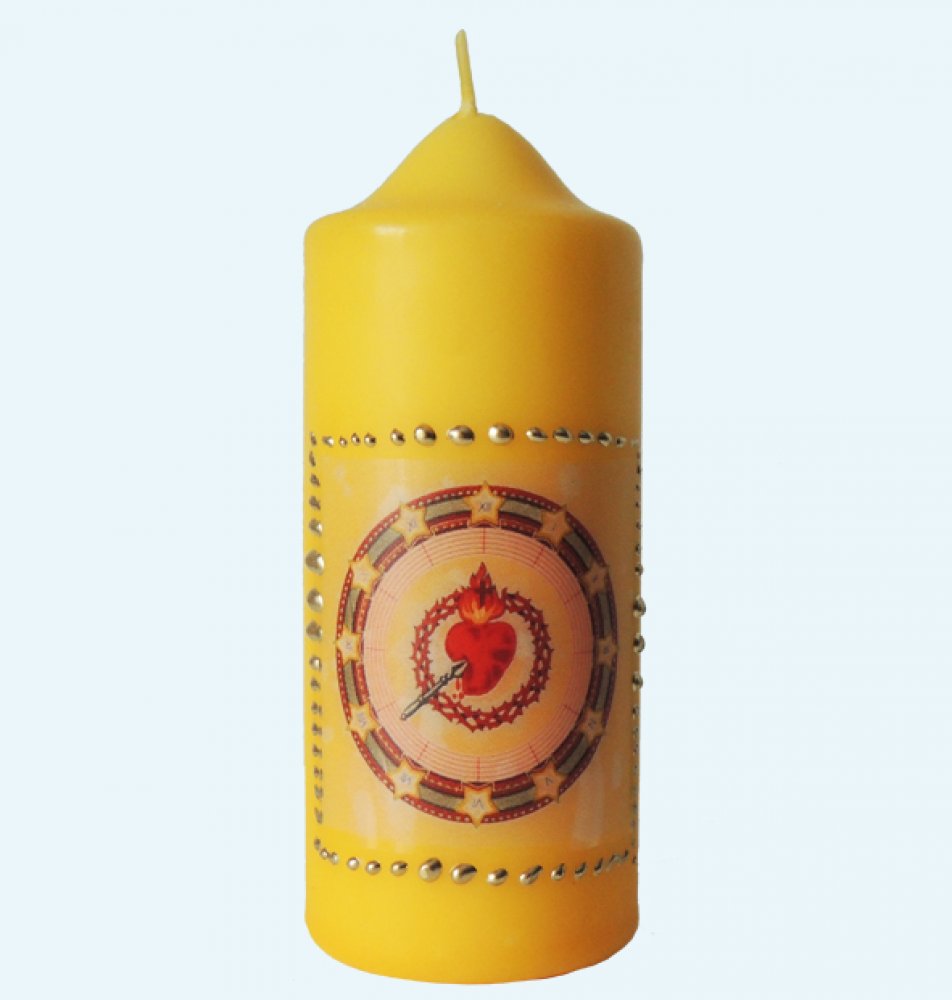 Świeca wykonana z wosku, ozdobiona naklejką z emblematem Straży Honorowej Najświętszego Serca Pana Jezusa.