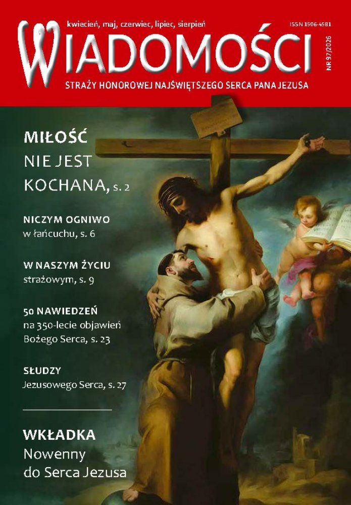 Nowy numer „Wiadomości” rozpoczynamy artykułem Miłość nie jest kochana (s. 2), w którym dr Natalia Gorczowska przywołuje słynne zdanie św. Franciszka z Asyżu, patrona Straży Honorowej NSPJ, i przypomina, co słowa te znaczą dla członków naszego Arcybractwa. Do postaci świętego nawiązuje także krzyżówka dla najmłodszych, którą można znaleźć w dziale Skarbczyk Małego Rycerza. W drugiej części wywiadu Niczym ogniwo w łańcuchu ks. dyr. Christian Catayée mówi o różnicach między nabożeństwami do Jezusowego Serca i do miłosierdzia Bożego oraz o prawidłowym rozumieniu Godziny Obecności. Z kolei w artykule 50 nawiedzeń na 350-lecie objawień Bożego Serca ks. dyr. Krzysztof Zimończyk SCJ opisuje najważniejsze fakty związane z peregrynacją relikwii i obrazu św. Małgorzaty Marii Alacoque w polskich parafiach. Z okazji zbliżającej się beatyfikacji męczenników salezjańskich w tekście Słudzy Jezusowego Serca dr Natalia Gorczowska przybliża sylwetki trzech spośród nich, którzy uświęcali się poprzez członkostwo w Straży Honorowej lub pełnienie posługi księdza opiekuna bractw strażowych. Oprócz stałych rubryk w numerze znalazły się także świadectwa łask otrzymanych za wstawiennictwem s. Marii od Najświętszego Serca Bernaud.